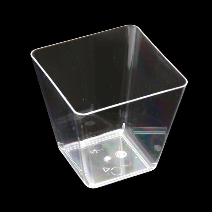 Pojemnik został wykonany z przezroczystego i cienkiego polistyrenu, który doskonale imitującego szkło, co nadaje mu bardzo elegancki i profesjonalny wygląd.