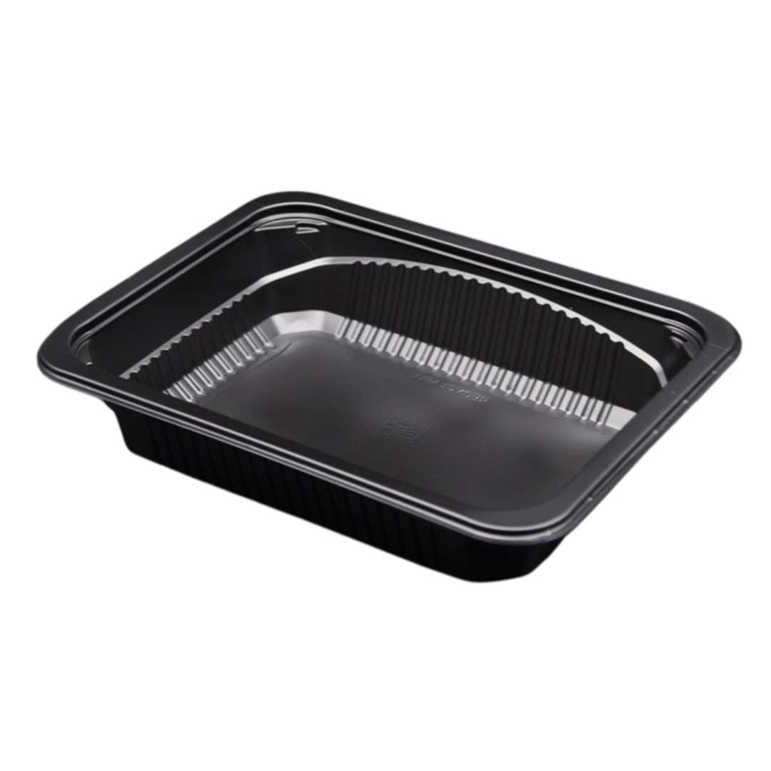 Pojemnik prostokątny żebrowany czarny do zgrzewu lub ze szczelną pokrywką transparentną kupowaną oddzielnie.